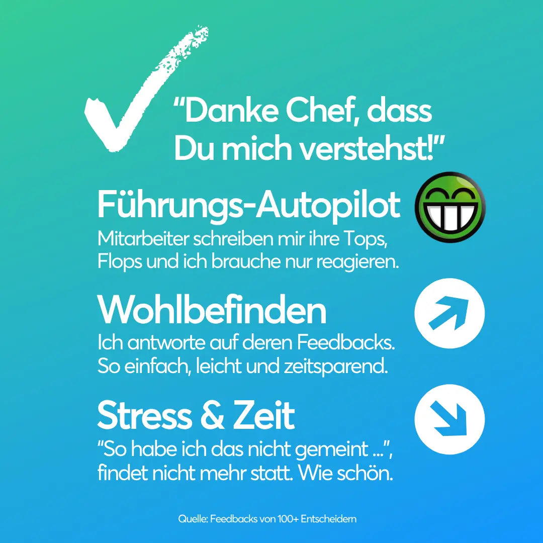 "Das Wohlbefinden des Mitarbeiters und unsere gesamte Teamstimmung sind uns enorm wichtig. Durch die App erhalte ich das persönliche Feedback und brauche nur noch reagieren. Spart echt viel Zeit und so fällt führen wieder leicht!"